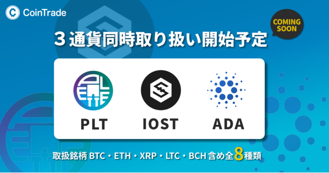 株式会社マーキュリー(本社:東京都世田谷区 代表取締役社長:都木 聡、以下、「当社」)は、当社の提供するサービス「CoinTrade」(コイントレード)において、エイダコイン(ADA)、パレットトークン(PLT)、アイオーエスティー(IOST)の取り扱いを近日中に開始することをお知らせいたします。これにより「CoinTrade」(コイントレード)では8種類の暗号資産を取り扱うこととなります。
