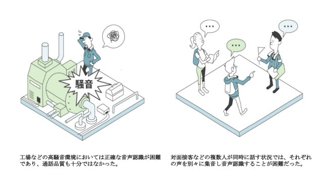 声を適切にデジタル化することは、現場のデジタルトランスフォーメーション(DX)を進める上で重要となっています。しかし、建設現場や工場などの高騒音環境や、対面接客などの複数人が同時に発話する状況において、目的の音声のみをクリアに収録することは困難であり、現場で発生する音声の有効なデータ活用が進んでいませんでした。