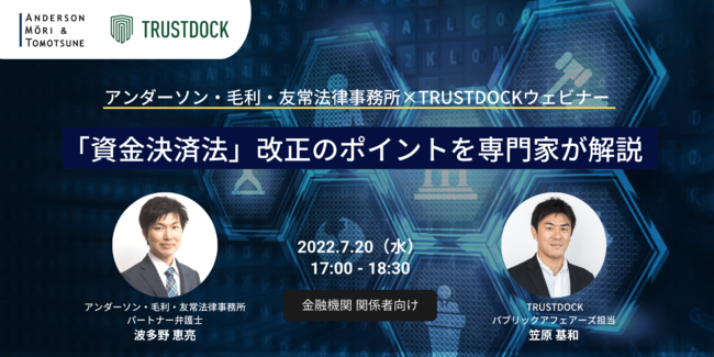 株式会社TRUSTDOCK(本社:東京都千代田区、代表取締役:千葉 孝浩、以下 TRUSTDOCK)は、「資金決済法」改正のポイントを解説する無料のウェビナーをアンダーソン・毛利・友常法律事務所 パートナー弁護士 波多野恵亮氏をゲスト登壇者としてお招きし、2022年7月20日(水)に開催いたします。