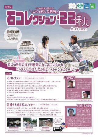 3年目となる今回は、ヒスイだけではなく糸魚川で見つかる石の多様性を学び、多くの石に出会うことを目的としております。大人3000円、小人2500円、幼児無料。定員は1回あたり20名。8月19日(金)から10月22日(土)まで計10回の開催を予定。お申し込みはWEBから。7月4日(月)10時より申し込みスタート