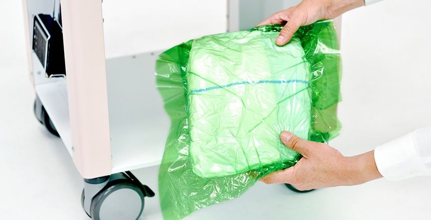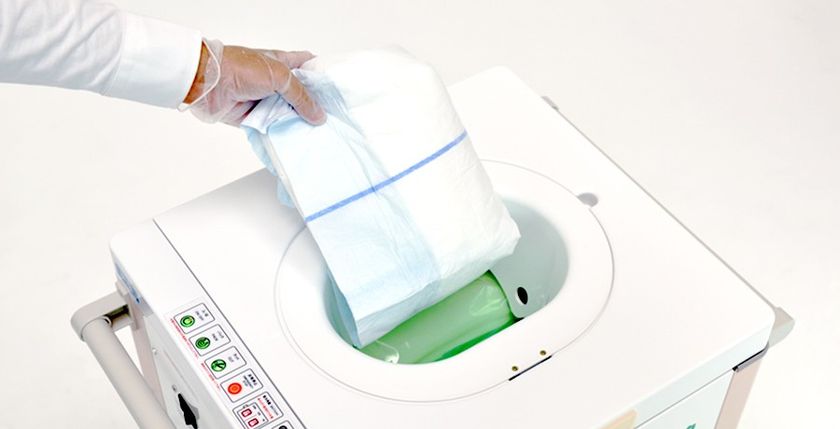 病院や介護施設の臭気・感染対策で活躍している「エコムシュウ」は、交換後の汚れたおむつや、感染対策に使用した使い捨て個人防護具(マスク・エプロン・手袋 等)を丸ごとパックすることで、嫌なにおいだけでなくノロウイルスなどの感染を引き起こす菌・ウイルスを瞬時に封じ込めることができるシステムです。
