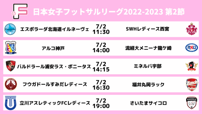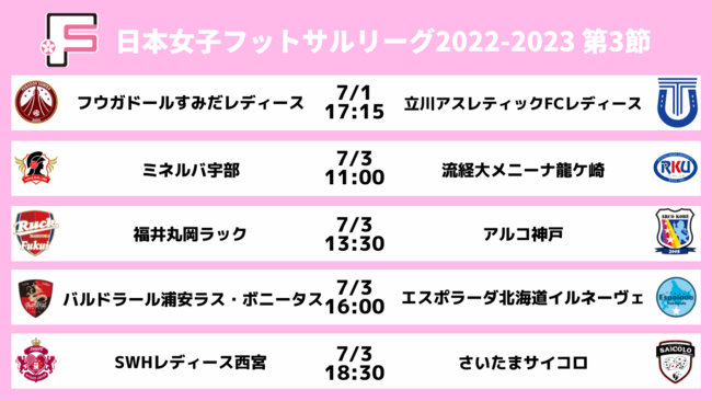 7月1日(金)から7月3日(日)の3日間、バルドラール浦安アリーナ、墨田区総合体育館にて日本女子フットサルリーグ2022-2023 第2節・第3節を開催します。今シーズンもSPOTV NOW(登録・視聴無料)にて全試合をライブ配信いたしますので、ぜひご視聴ください!