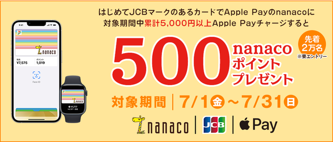 株式会社ジェーシービー (本社:東京都港区、代表取締役会長兼執行役員社長:浜川 一郎、以下:JCB)は、2022年7月1日(金)から7月31日(日)の期間、「JCB×nanaco Apple Payチャージデビューキャンペーン」を実施します。