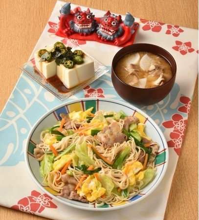 「チャンプルー」とは食材を炒め合わせること。野菜や肉などの具材に、固めにゆでたそうめんを加えて炒めた、沖縄の家庭料理の一つです。シンプルな味付けであっさりと食べられます。