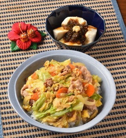 沖縄ちゃんぽんは、麺ではなく野菜やコンビーフを炒めたものを玉子でとじ、ご飯にのせた料理をさします。今回は沖縄のローカル食材のコンビーフハッシュを使用。丼ではなく平たい器に盛るのもポイントです。
