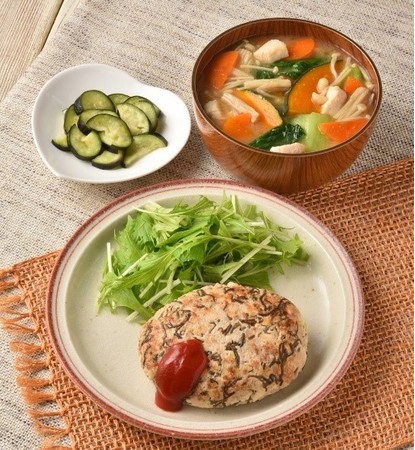 ひき肉に豆腐と沖縄産のもずくを加えることで、カロリーダウン&ボリュームアップしたヘルシーハンバーグ。もずくでミネラルと食物繊維がプラスされています。