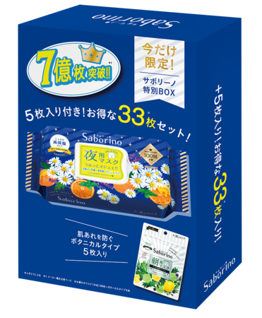他、店頭ではフェイスマスク累計出荷枚数7億枚突破を記念してお得なキットを2022年7月19日より数量限定で販売します。夜用フェイスマスク・サボリーノ お疲れさマスク28枚入りと朝用フェイスマスク・サボリーノ 目ざまシート ボタニカルタイプ5枚入りがセットになったお得なキット内容です。