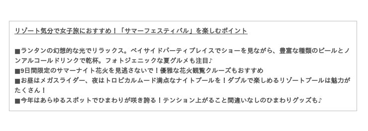 トロピカルなムードあふれるベイサイドパーティプレイスや夏のグルメ、イルミネーション・花火とともに楽しむナイトプールなど、リゾート気分で一日中楽しめるスポットが盛りだくさんです。