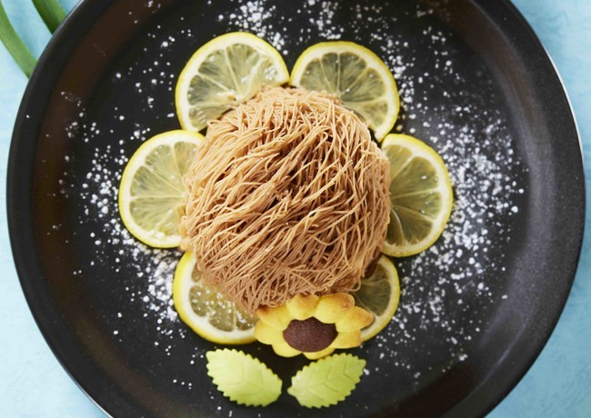 周りのレモンでひまわりをイメージした生絞りモンブランの中には、なんとレモンシャーベットが!