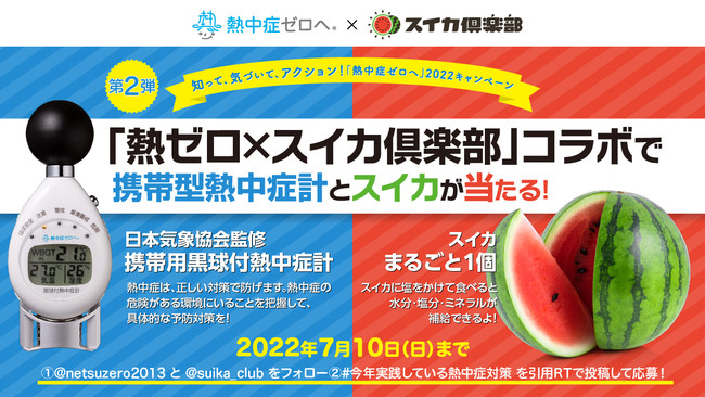 キャンペーン第2弾では、本プロジェクトの公式Twitterアカウント(@netsuzero2013)と「スイカ倶楽部」の公式Twitterアカウント(@suika_club)をフォローし、それぞれのアカウントから投稿されるハッシュタグ「#今年実践している熱中症対策」を含むキャンペーンツイートのどちらかを、皆さまの「今年実践している熱中症対策」を記載して引用RTで投稿すると、抽選で携帯型熱中症計とスイカが当たります。携帯型熱中症計は、熱中症の危険がある環境にいることに気づくきっかけとして、またスイカは水分補給のアイテムとして、熱中症の予防・対策にご活用ください。