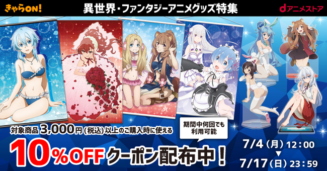 4,800作品以上のアニメが見放題(※)の「dアニメストア」( https://animestore.docomo.ne.jp/ )では、2022年7月4日~7月17日まで「【きゃらON!限定】異世界・ファンタジーアニメグッズ対象10%OFFクーポン」を配布いたします。