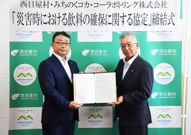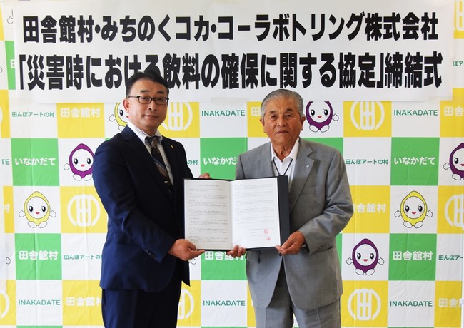 このたび、みちのくコカ・コーラボトリング株式会社(本社: 岩手県盛岡市、代表取締役社長: 谷村 広和)は、青森県 田舎館村(村長: 鈴木 孝雄)、西目屋村(村長: 桑田 豊昭)との間で、「災害時における飲料の確保に関する協定」を締結することとし、7月4日(月)にそれぞれ締結式を開催いたしました。