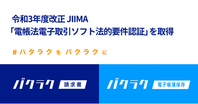 株式会社LayerXが提供する 「バクラク請求書」と「バクラク電子帳簿保存」は、公益社団法人日本文書情報マネジメント協会(以下JIIMA)の令和3年度改正に対応した「電帳法電子取引ソフト法的要件認証」を新たに取得しました。すでに取得している「電帳法スキャナ保存ソフト法的要件認証」と合わせて、スキャンした紙の書類か電子で受け取った書類かに問わず、完全ペーパーレス化へ向けて安心してご利用いただけるようになりました。