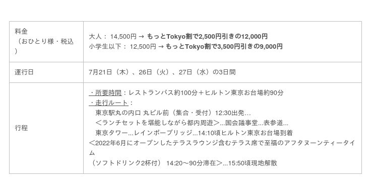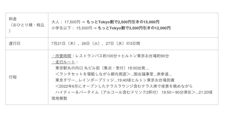 4. 「もっとTokyo」対象で、通常料金よりおひとり様あたり大人2,500円引き、小学生以下3,500円引きとなります。