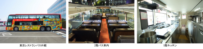 移動と食の融合により新たな感動体験を提供する「レストランバス」は、1階にキッチン、2階には対面式の座席とテーブルを備え、透明で開閉可能なオープンルーフは開放感があり、いつもと違う目線から眺める景色と、本格的な料理をお楽しみいただけます。東京レストランバスの外装は、東京らしさをイメージし、多数のビル群や観光名所を“食”と掛け合わせてポップなカラーリングでデザインしています。内装は、シックな色合いでまとめ、夜は調光可能なLEDと間接照明により、高級感あふれる落ち着いた空間になっています。
