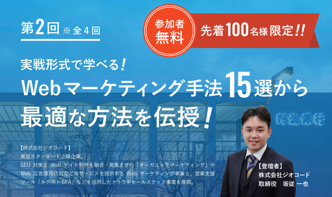 阿波銀行が7月20日に開催するセミナー「実践形式で学べる!Webマーケティング手法15選から最適な方法を伝授!」にジオコード取締役の坂従が講師登壇