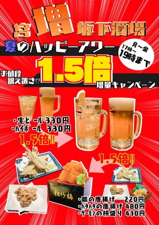 宮益坂下酒場で夏のハッピーアワー 1.5倍増量キャンペーン開催中!対象メニューのボリュームが1.5倍!いつもと同じ価格で生ビールもハイボールも増量!ランチメニューも新しく!