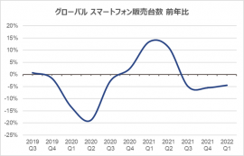 2022年4月の世界全体、グローバルのスマートフォン販売台数は前年比4%減だった。戦争やロックダウンといった下押し要因に加え、世界的な物価上昇による悪影響も懸念される。