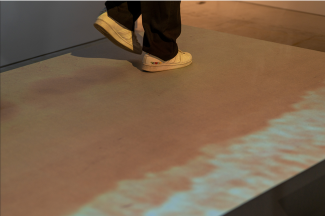 最初に体験したのは「砂浜」。プロジェクションマッピングにより、床に砂浜の地面が映し出され、場内に波の音が流れる。床の上を歩くと、ムギュッという紛れもない砂を踏みしめている感覚を覚える。映像では波打ち際が再現され、波が自分の足下のすぐ近くまで定期的に押し寄せる。足を踏み出す強弱によって、砂を踏みしめる感覚も同様に強弱が付き、踏んだ場所は足跡が付くかのように、そこだけ砂の色が濃くなるのが非常にリアルだ。繊細な振動を作り出す技術によって、生々しい感触が再現されているのだという。