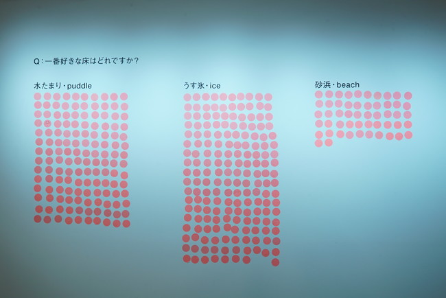 訪れたのは平日の夕方だったが、ひっきりなしに来場者が現われ、思い思いに感嘆の声を上げて楽しんでいた。体験後に「一番好きな床」を選ぶのだが、一番人気は「うす氷」。「砂浜」と「水たまり」と比べ、一番現実に体験する機会が少ない触感を体験できたことへの喜びが大きいのかもしれない。