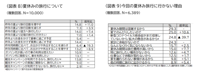 旅行に行かない人に理由を聞いたところ、最も多かったのが「夏休み期間は混雑するから(29.3%)」、次が「家でのんびりしたいので(25.0%)」となりました。また「新型コロナウイルス感染症がまだ収束していないから/拡大の懸念があるから(24.8%)」は、前年から39.7ポイント減と大きく減少しました(図表9)。