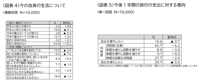 「今後1年間の旅行支出に対する意向」については、「旅行支出を増やしたい(14.6%)」は0.7ポイント減少となっているものの、「旅行支出を減らしたい(39.7%)」は5.5ポイントの減少となり、旅行支出についての意向が前年より高い結果となりました(図表5)。今後の生活への不安が大きい一方で、足元の消費は、長引くコロナ禍による我慢もあり、先行きが見通せないからこそ今のうちに消費したい気持ちや、節約しながらもメリハリのきいた消費で生活を充実させたい気持ちが調査からうかがえます。