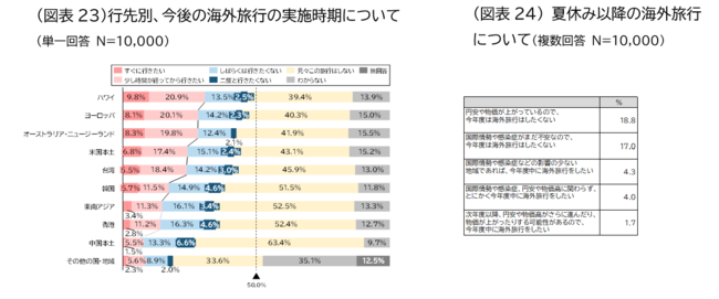 海外旅行の実施時期についての考え方については、最も高かったのが、「円安や物価が上がっているので、今年度は旅行したくない(18.8%)」、続いて「国際情勢や感染症がまだ不安なので、今年度は旅行したくない(17.0%)」となり、消極的な意見が上位となりました(図表24)。
