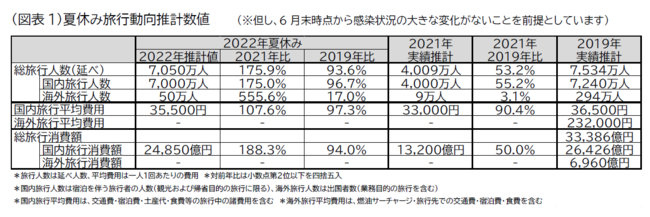 夏休み期間(2022年7月15日~8月31日)の国内の旅行動向については、各種経済指標、交通機関各社の動き、宿泊施設の予約状況、各種定点意識調査などをもとに算出し、国内旅行人数は7,000万人(対前年175%、対2019年96.7%)と推計します。また、国内旅行平均費用は35,500円(対前年107.6%、対2019年97.3%)、総額2兆4,850億円と推計します。