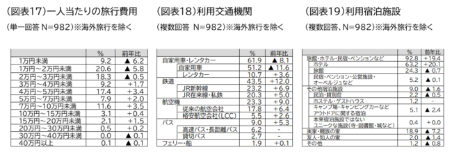 一人当たりの旅行費用:「1万円~2万円未満(20.6%)」が最も多く、次いで「2万円~3万円未満(18.3%)」となったものの、いずれも前年より減少しました。一方、「3万円~4万円(9.2%)」「4万円~5万円未満(17.4%)」はそれぞれ増加し、3万円以上はすべての項目で前年より増加しました(図表17)。