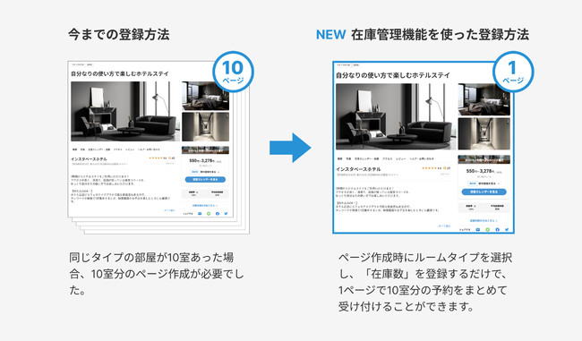 「シングルベッドAタイプ」の部屋が10室あった場合、今までは10室分のページを作成していました。今後は「シングルベッドAタイプ」のページ作成時に、ルームタイプで「個室」を選択し、「在庫数」を10室と登録するだけで、1ページで10室分の予約をまとめて受け付けることができます。