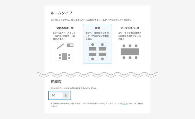 ルームタイプから「個室」を選択し、貸し出すことができる個室を「在庫数」に入力し、該当する写真や条件を設定