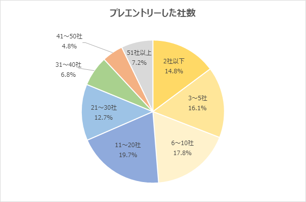 プレエントリーした社数は、「11~20社」19.7%で最多。次いで、「6~10社」17.8%が続きました。「2社以下」14.8%、「3~5社」16.1%となっており、約半数にあたる48.7%の学生は、プレエントリー社数が10社以下であることが分かります。