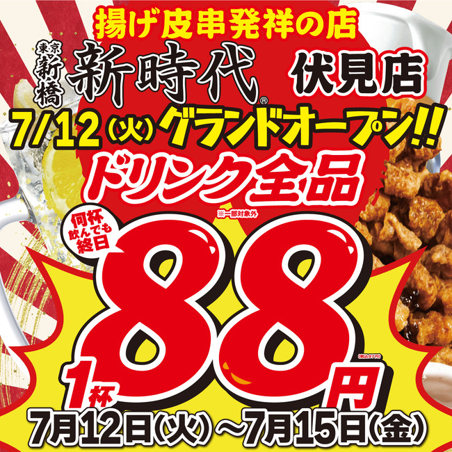 「新時代 伏見店」のオープンを記念し、ドリンク全品を1杯88円(税込97円)でお楽しみ頂けるキャンペーンを開催します。