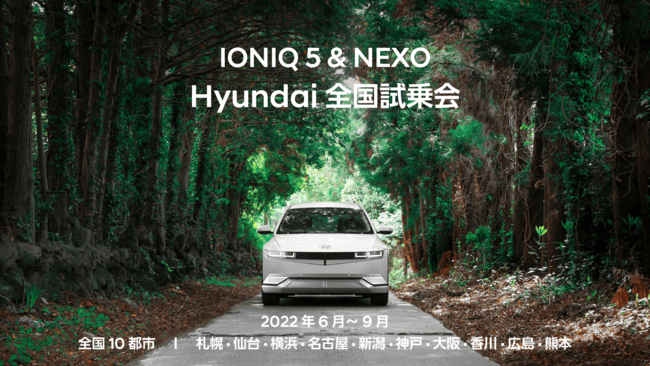 Hyundai Mobility Japan 株式会社(本社:神奈川県横浜市西区、代表取締役社長:李正旭、以下Hyundai)は2022年6月23日(木)より全国10都市にて順次開催中のIONIQ 5(アイオニック ファイブ)&NEXO(ネッソ)Hyundai 全国試乗会において、新たに新潟試乗会と香川試乗会の実施会場を決定いたしましたので、お知らせいたします。