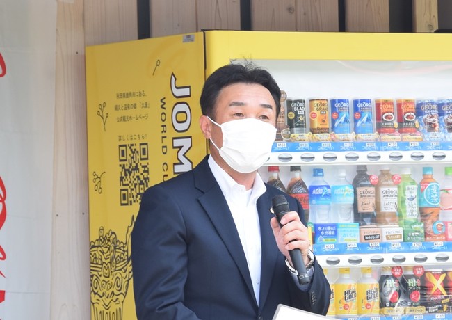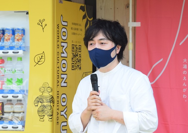 「このたび秋田県で3台目の設置となるこのPR自販機は、北海道・北東北の縄文遺跡群を、より多くの方に知っていただきたいという思いから、伊藤副社長様のお力を借り、このようなポップでユニークなデザインとしております。自動販売機にもデザインされております『大湯環状列石』を、一層盛り上げていければという所存でございます。」