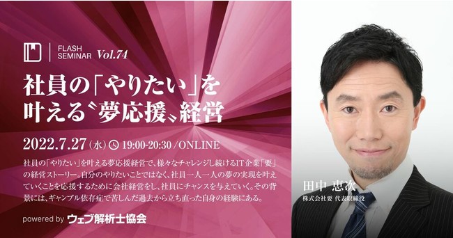 2022/7/27(水)19:00 - 20:30 Flashセミナー Vol.74【無料】社員の「やりたい」を叶える“夢応援”経営