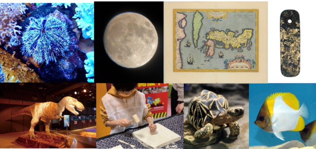 写真上段 左から:シラヒゲウニ(美味しくてすごい生き物展)、学習用天体望遠鏡で撮影した月(惑星観賞会)、オルテリウス『世界の舞台』より日本地図部分・モンゴル帝国の通行証「牌子(ぱいざ)」(大航海時代へ)
