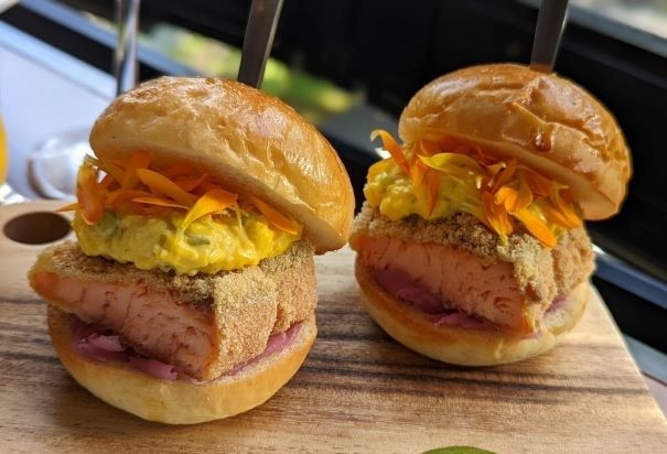 信州サーモンのフライに、サフランのタルタルソースと⾚玉葱のマリネをサンドしたかわいらしいサイズのバーガー