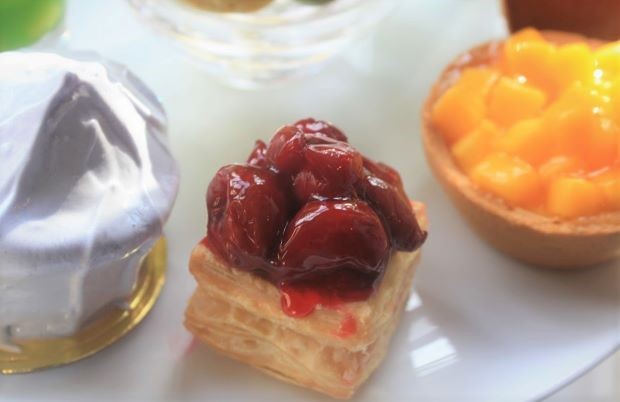 スタッフが収穫したサワーチェリーをのせたカスタードパイ