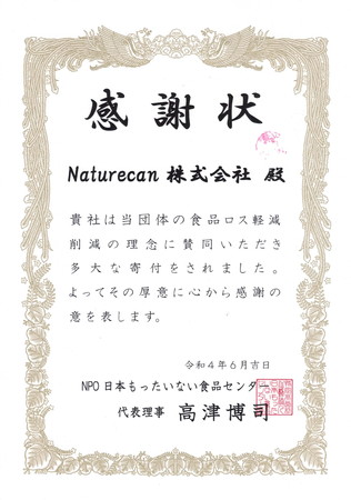 CBD専門店Naturecanは、この度NPO日本もったいない食品センターより感謝状を授与されました