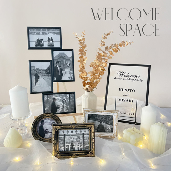 前撮り写真や思い出の写真を入れて飾ると、お二人だけの特別なウェルカムスペースが完成いたします。