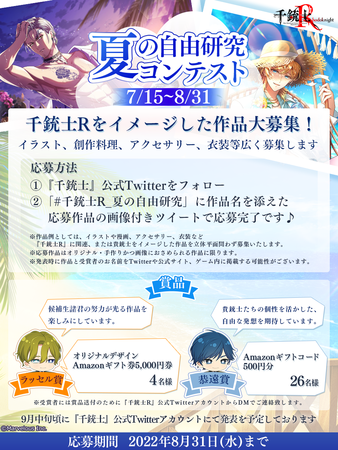 夏休みスペシャルキャンペーン第3弾として、Twitterにて「夏の自由研究コンテスト」を開催中!応募作品はイラスト、創作料理、アクセサリー、衣装等ジャンルを問わず、『千銃士R』をイメージした作品であればOK!「#千銃士R_夏の自由研究」と作品名、作品の画像をつけてツイートしてくださいね!開催期間は2022年8月31日(水)23:59まで。沢山のご応募お待ちしております!