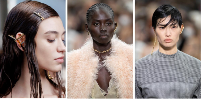 幅広いレンジで構成される本コレクションは、クラシックなテニスジュエリーのワークマンシップを思わせるオールオーバークリスタルと、プレーンなピースとの組み合わせが特徴です。ネックレスやリング、ブレスレット、ピアスを含むフルラインナップに加え、ヘアクリップや、大胆なマキシイヤーカフも展開します。クリスタルのチョーカーやチェーンネックレス、イヤリングやブレスレットとお揃いの主張のあるフープピアスなど、豊富なアイテムが揃います。ランウェイでは、コレクションのミックス&マッチのアティチュードを強調するため、グローブにバングルとソフトブレスレットを重ねて着用しています。リングも同様に、異なるシェイプとサイズが組み合わされ、パワフルなルックを提案しています。