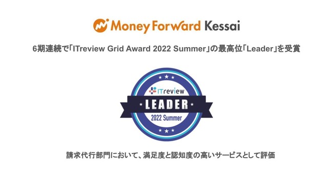 マネーフォワードケッサイ株式会社が提供する企業間後払い決済サービス『マネーフォワード ケッサイ』は、アイティクラウド株式会社が主催する「ITreview Grid Award 2022 Summer」の請求代行部門において、最高位である「Leader」を受賞しました。今回で6期連続の「Leader」受賞です。