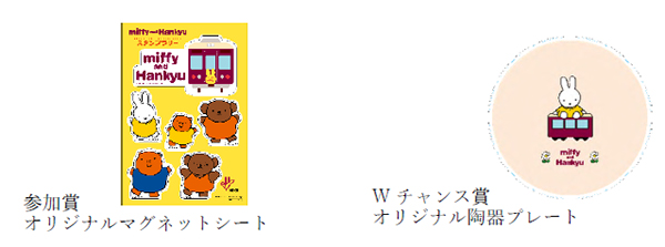※「miffy and Hankyu」阪急全線1日乗車券台紙とスタンプ台紙のそれぞれに付属している「Wチャンス賞応募券」を官製はがきに貼って、必要事項を明記のうえご応募いただくと、「オリジナル陶器プレート」を抽選で50名様に進呈します。