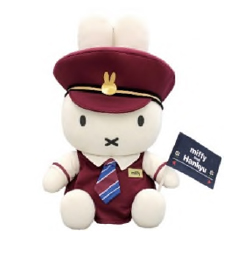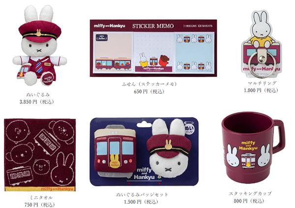 阪急電車をイメージした、マルーンカラーの制服を着たミッフィーのぬいぐるみや、阪急電車に乗ったミッフィーとなかまたちのステーショナリーなど、オリジナルデザインのコラボレーショングッズ(全23商品)を発売します。