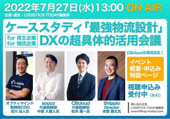 株式会社souco(本社:東京都千代田区、代表取締役:中原 久根人、以下souco社)は、2022年7月27日(水)に開催される物流ウェビナー「ケーススタディ『最強物流設計』for 荷主企業・物流企業 DXの超具体的活用会議」(LOGISTICS TODAY主催)に登壇することをお知らせします。