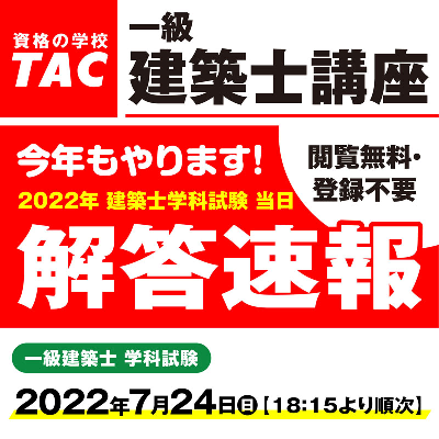 資格の学校TACでは、7/22(金)に発表予定の「令和四年 一級建築士設計製図試験の課題」に基づき、TACの見解を当日の14:00頃、TACホームページで公開いたします。