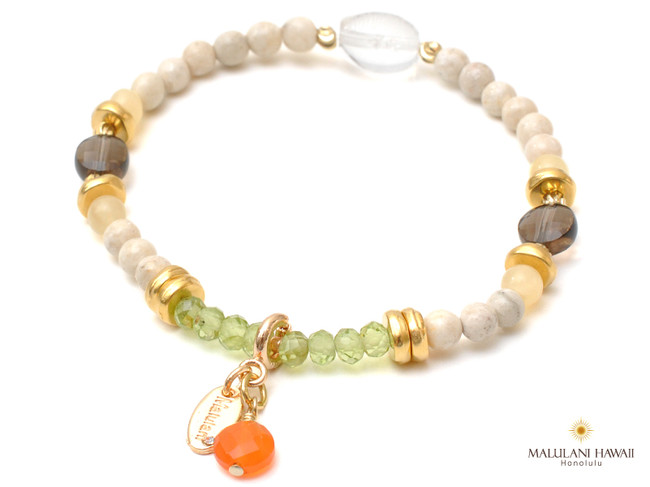 太陽の光で持つ人を守るペリドット、夢の実現をもたらすアマゾナイト、最良の方向への見極めをサポートするアパタイトをプラスし、強くしなやかなエネルギー満載のお守りブレスレットとなりました。