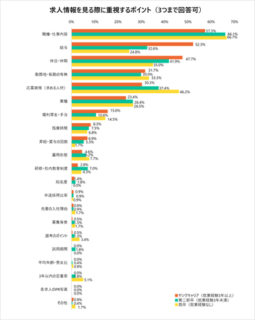 求人情報を見る際に重視するポイントは、「職種・仕事内容」が最多。2番目、3番目に回答を集めた項目は、ヤングキャリア・第二新卒・既卒で異なる結果になりました。ヤングキャリアは、「給与」「休日・休暇」の順に回答を集めています。第二新卒は、「休日・休暇」「応募資格(求める人材)」、既卒は「応募資格(求める人材)」「休日・休暇」の順に回答を集めました。仕事内容を軸に、ヤングキャリアは「待遇面」、第二新卒や既卒は「働きやすさ」や「自身が対象になるか」を重視していると推察されます。
